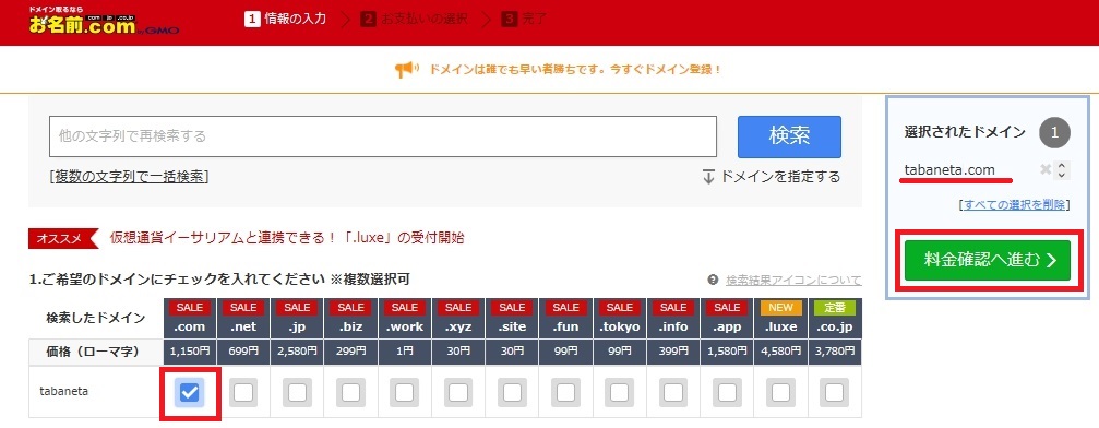 私の場合はTLDに”.com”を使いたかったので、”.com”にチェックをして[料金確認へ進む]をクリックします。