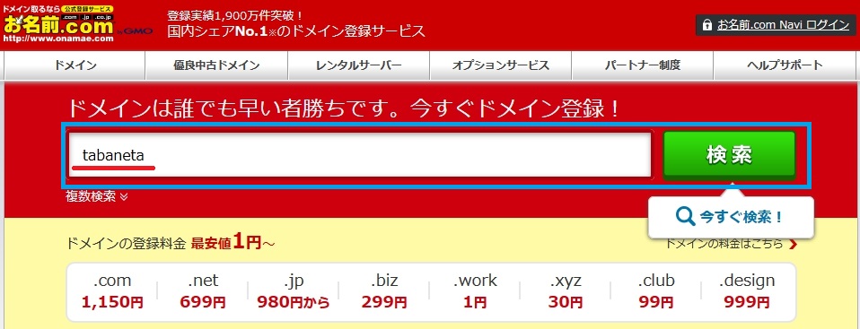 検索結果として[tabaneta]を名称とした、各TLDの価格と空き状況を確認することができます。